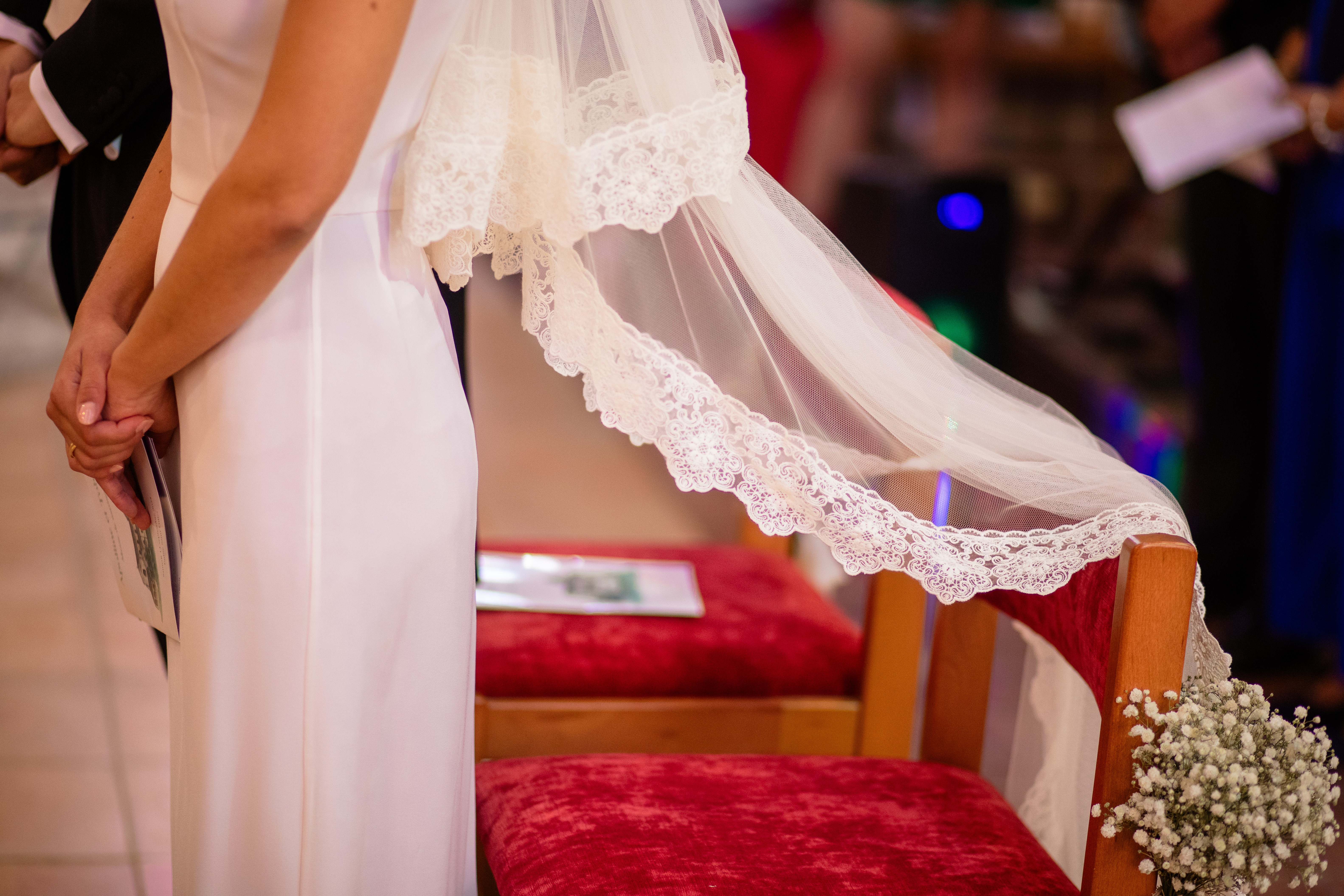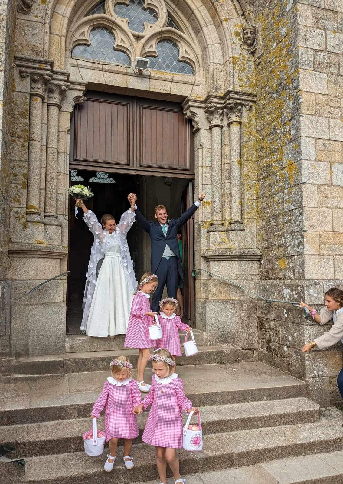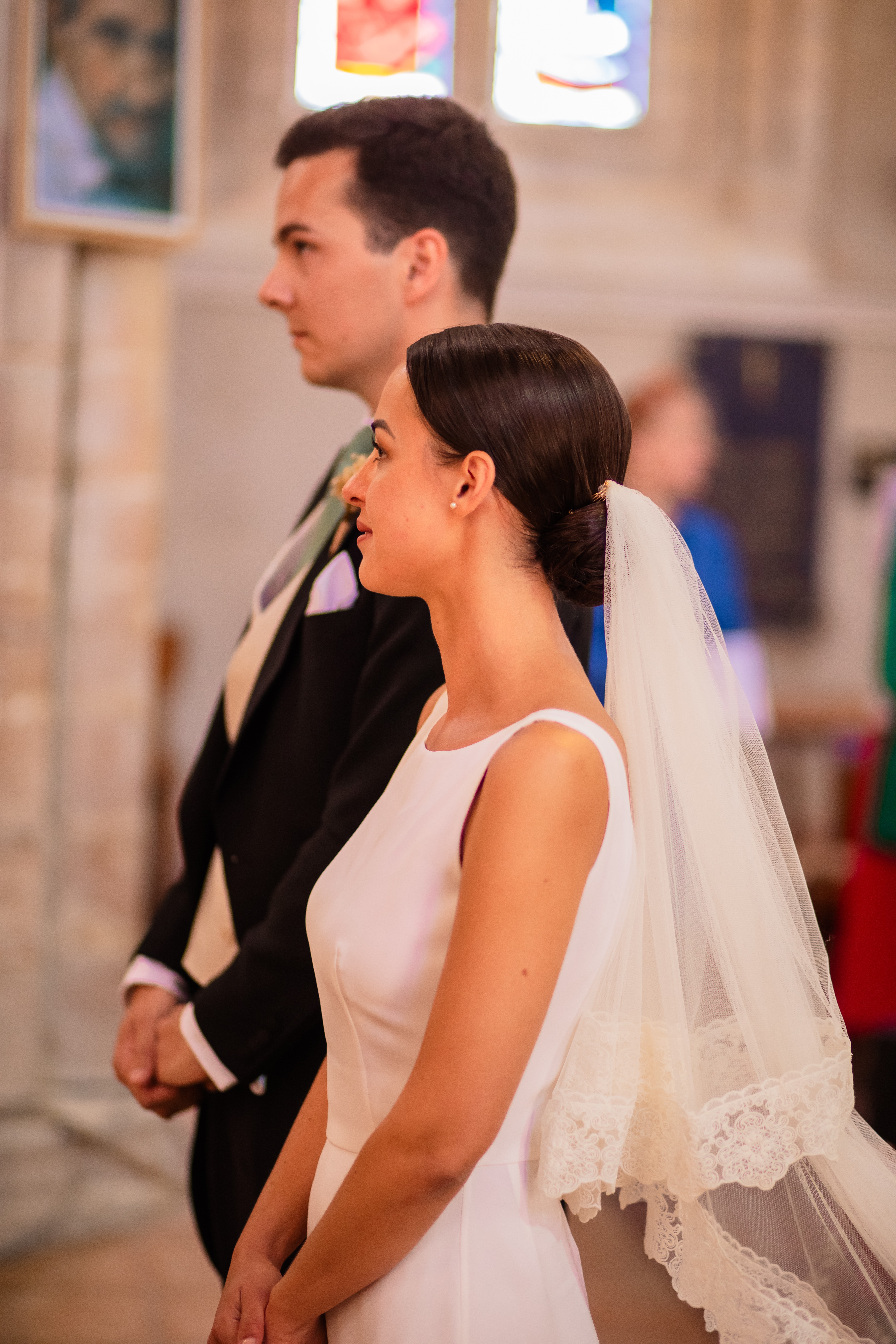 Pour l église Camille portait le modèle Clara en crêpe de soie avec un long voile bordé de dentelle, à la mairie elle portait une robe en coton couleur framboise avec un drapé.