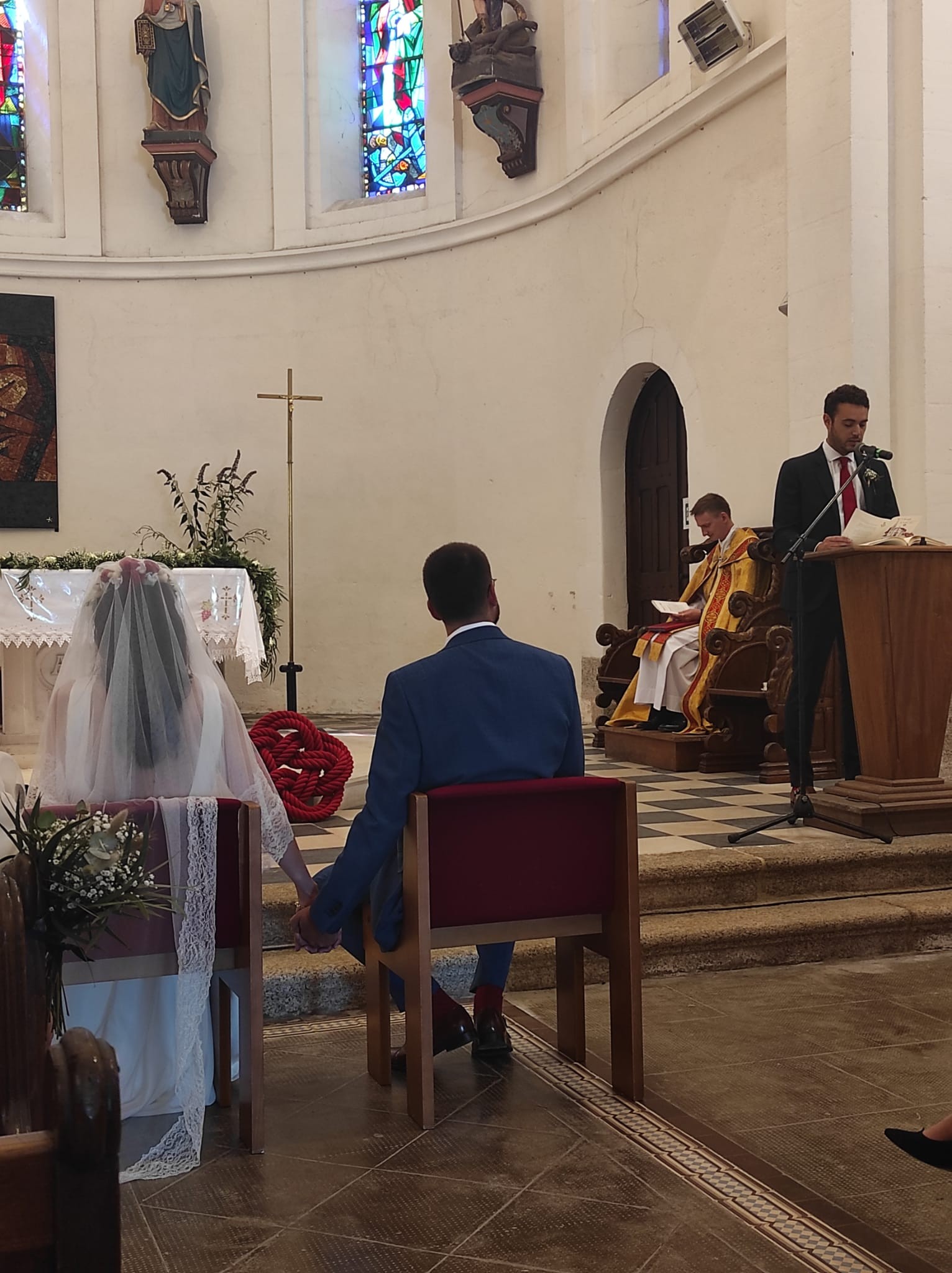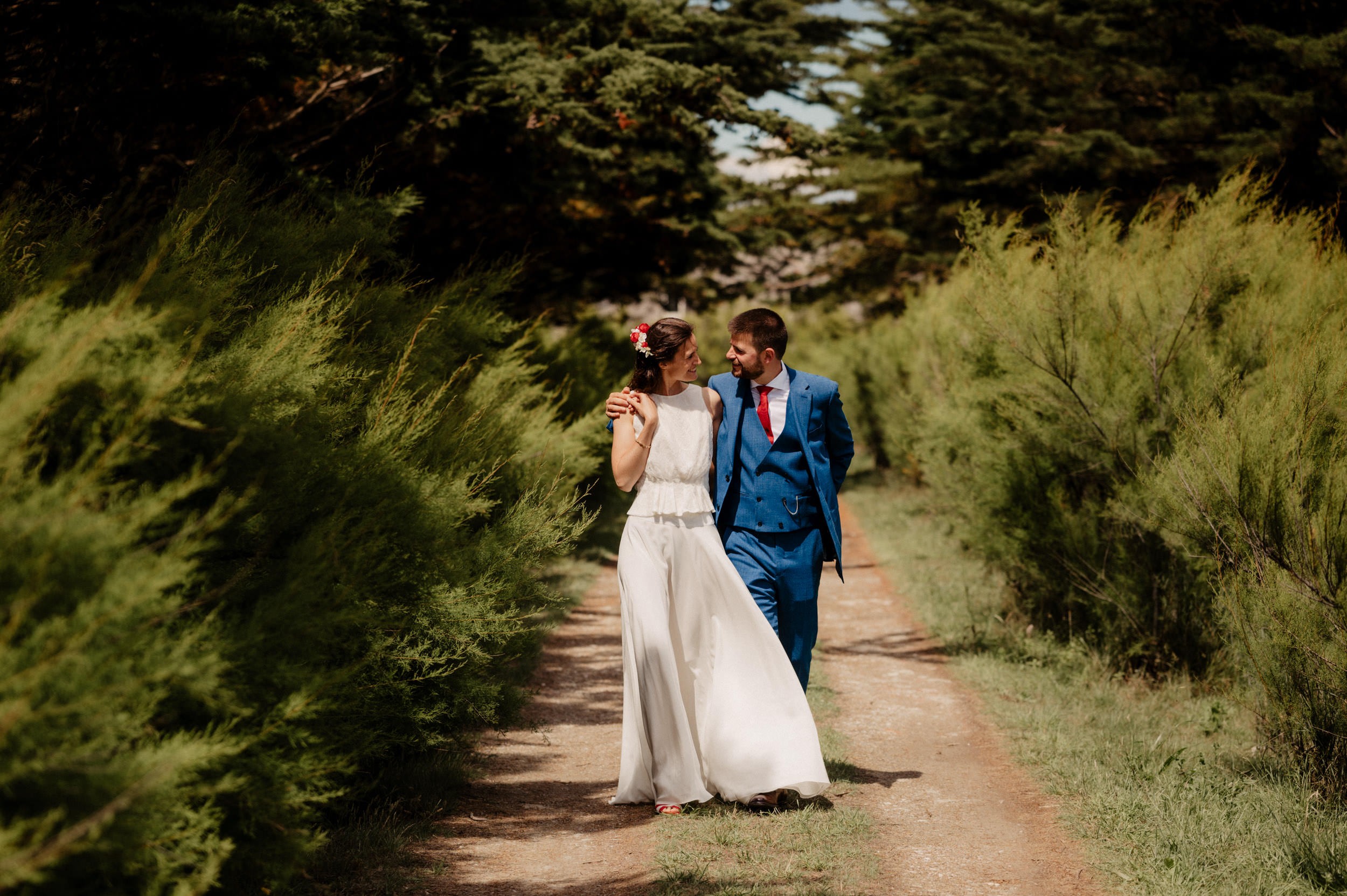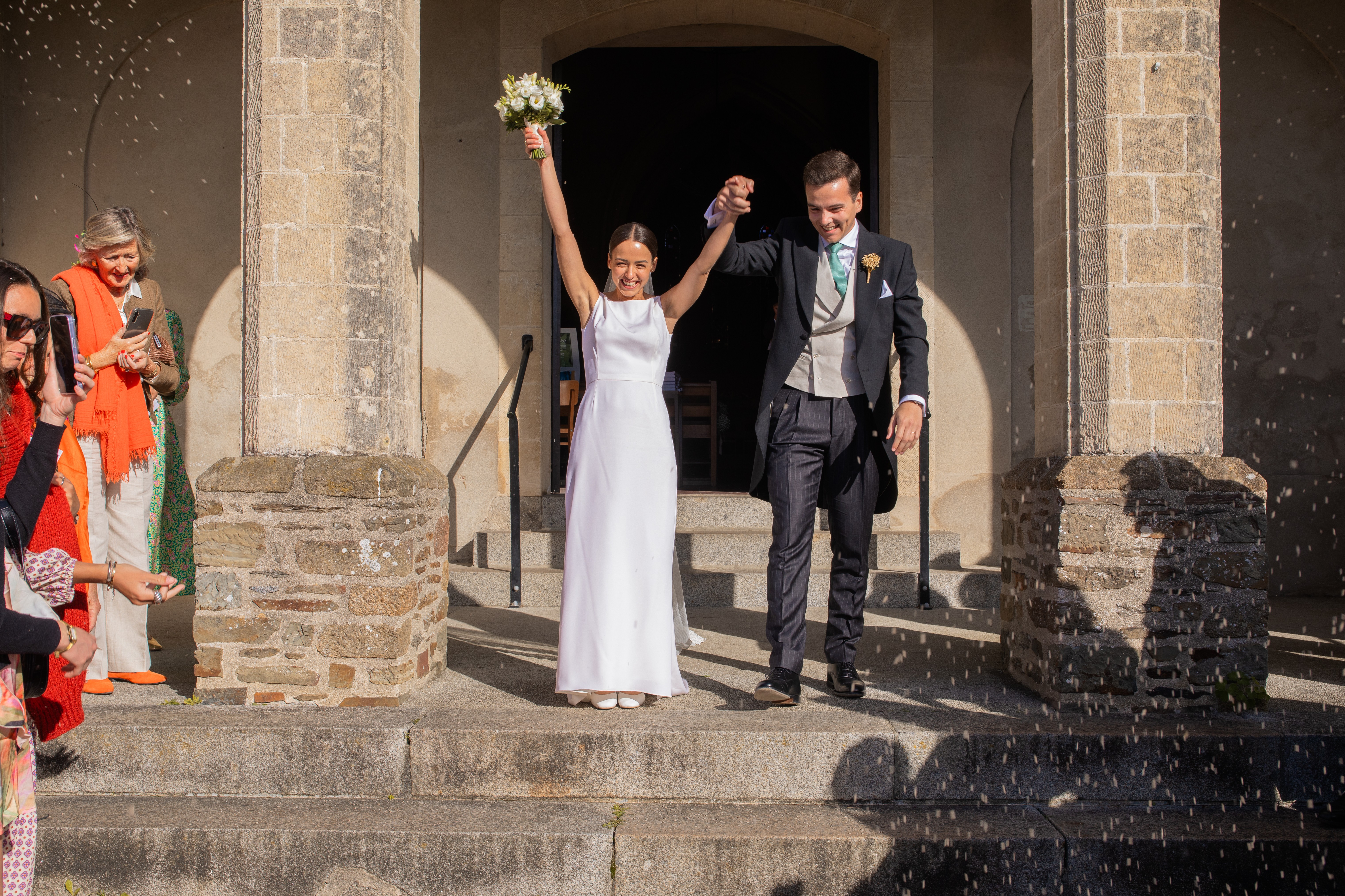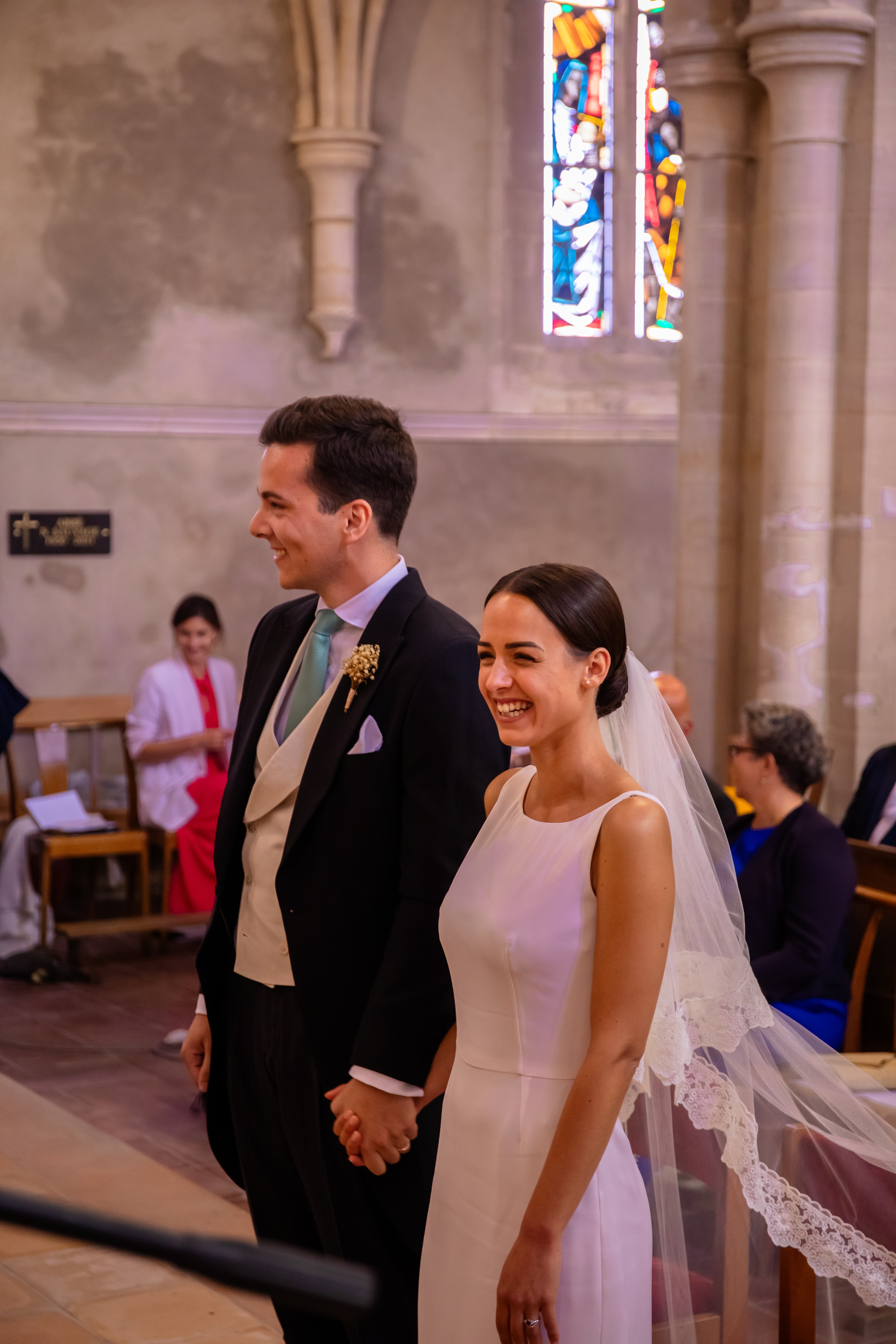 Pour l église Camille portait le modèle Clara en crêpe de soie avec un long voile bordé de dentelle, à la mairie elle portait une robe en coton couleur framboise avec un drapé.