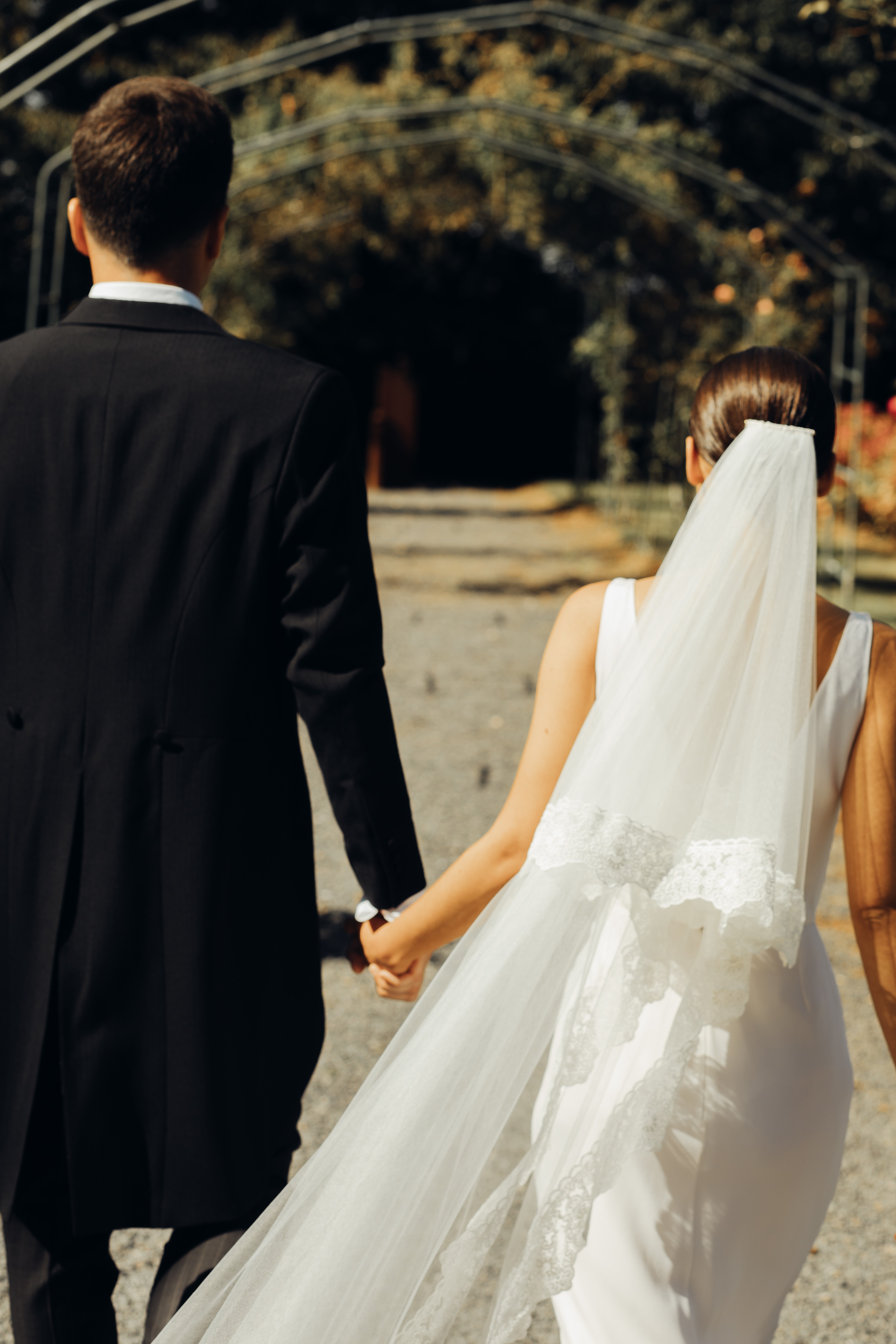 Manon porte le modèle 'Hortense' de la collection 'Cornaline' en crêpe de soie et dentelle de Calais, un long voile bordé de dentelle et délicate couronne en fleurs de porcelaine.