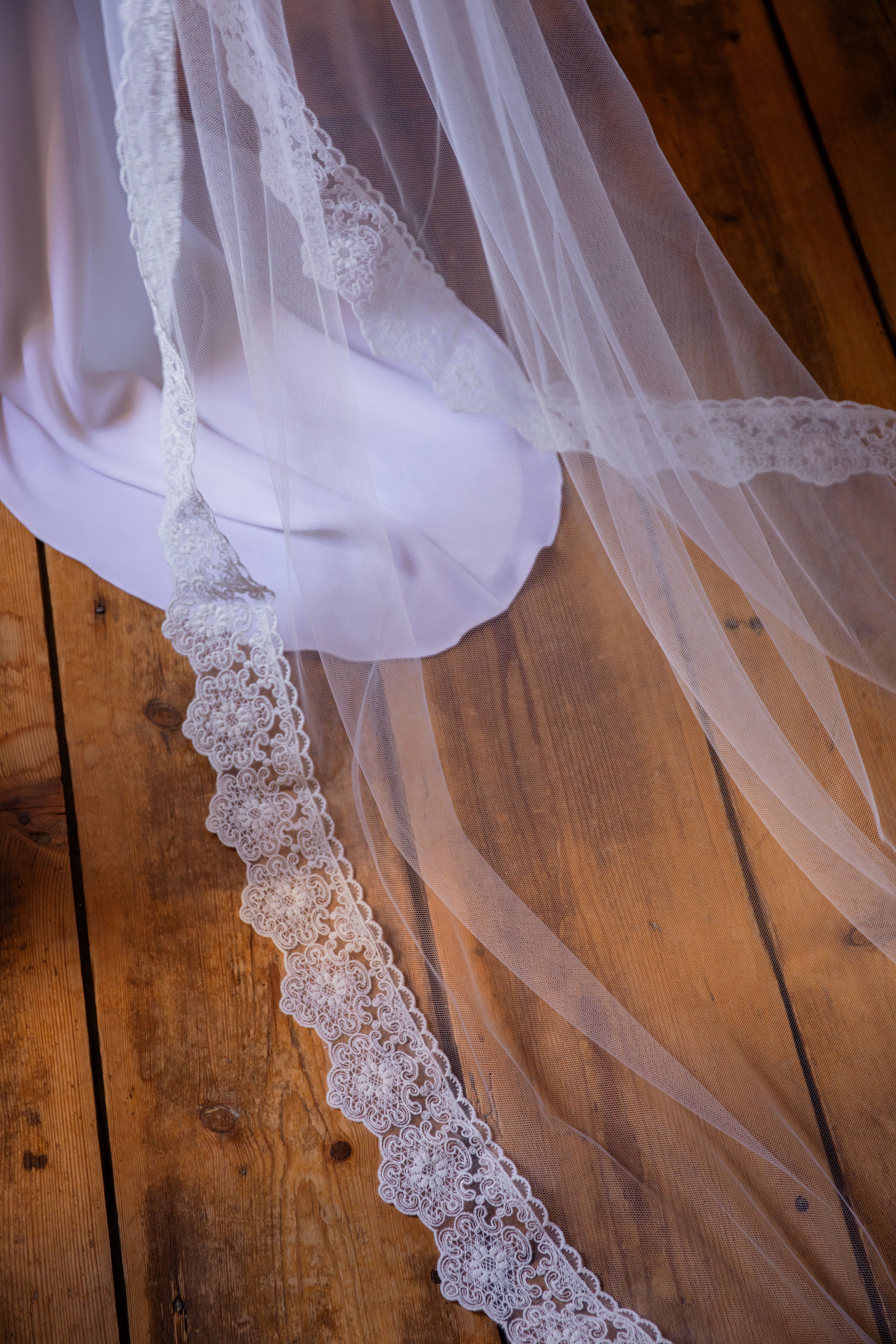 Voile de mariée en tulle bordé de dentelle et top en tulle plumetis doublé de satin de soie