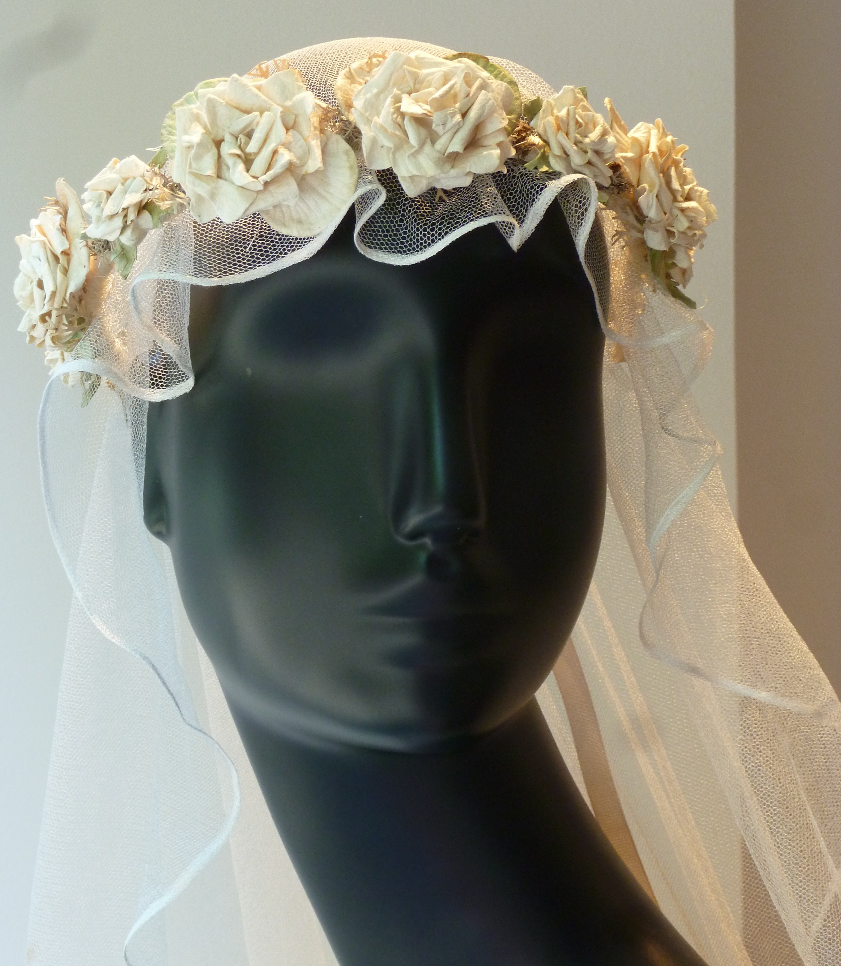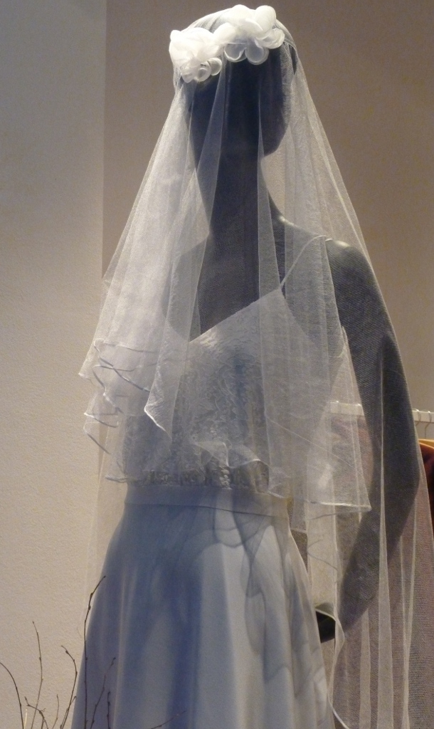 Modèle en crêpe de soie fin, dentelle, et voile bordé de dentelle