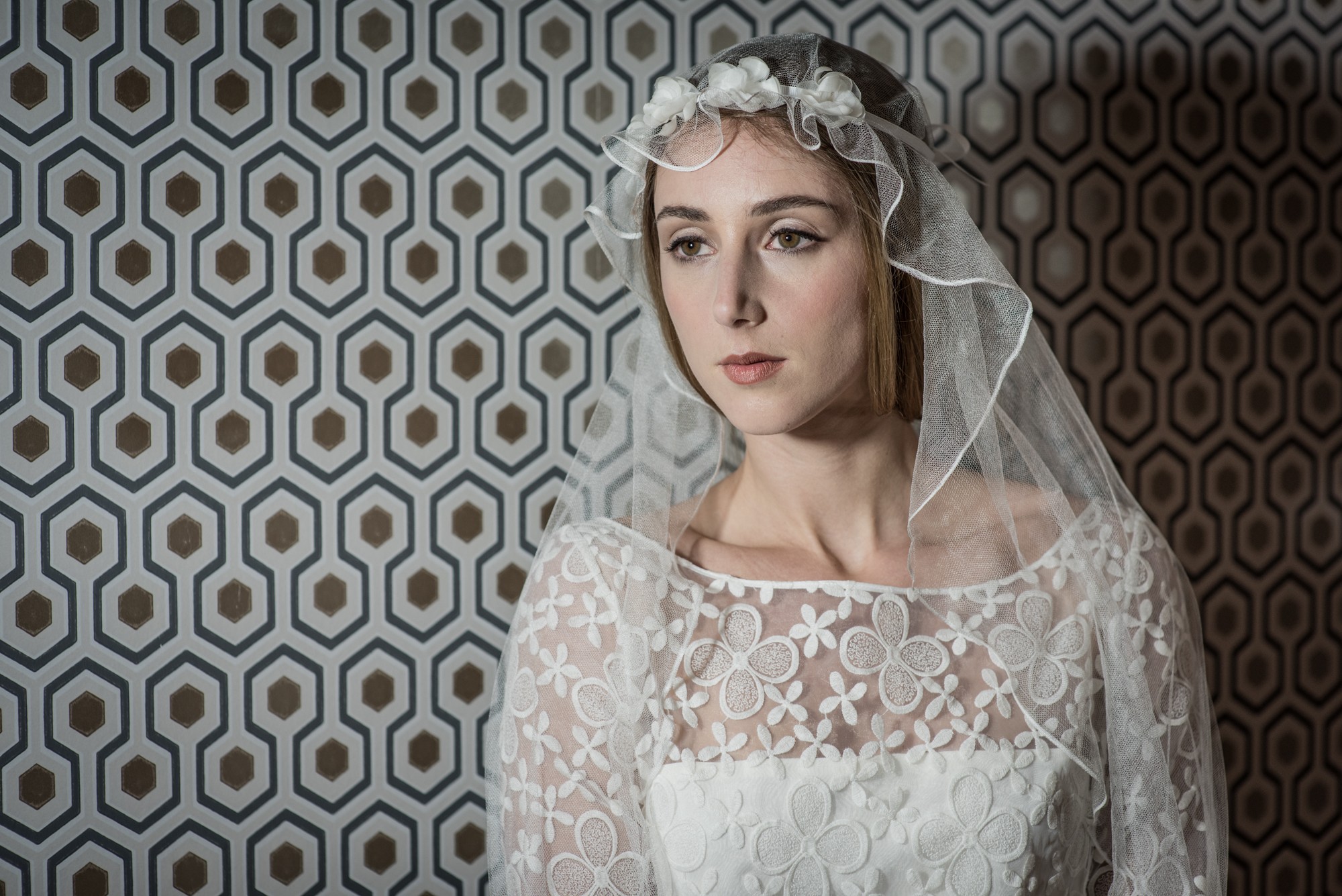 Nathalie portait le modèle Léa en mousseline de soie ivoire et dentelle de Calais. Le voile en tulle de soie bordé d'une très délicate dentelle vintage.