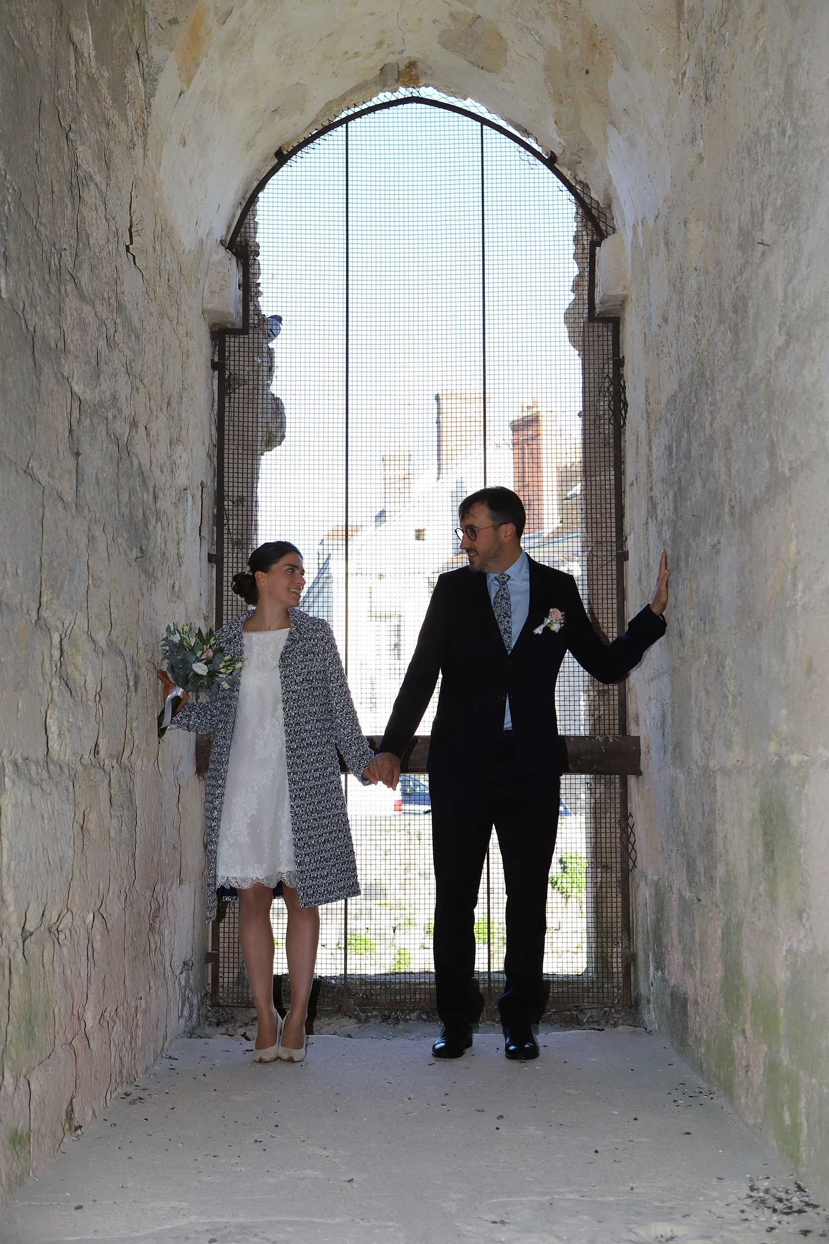 Mariage d'avril. Capucine porte la robe Naïade en dentelle de Calais ivoire avec pour ne pas avoir froid le manteau Ariane en laine rose poudré à fils d'or. Jolie touche de douceur et de raffinement.