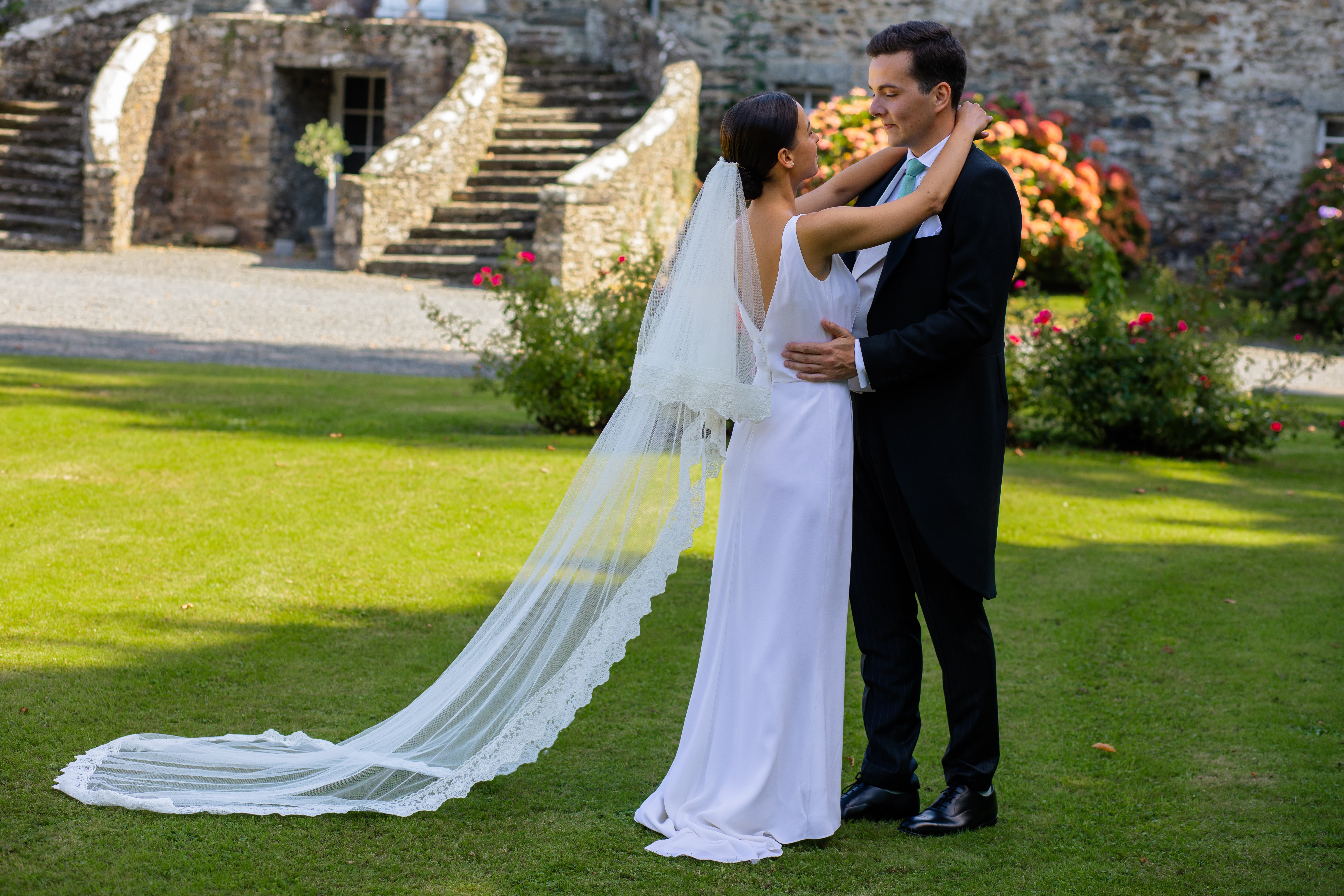Superbe mariée pour laquelle nous avons créé cette robe en crêpe de soie et son voile bordé de dentelle