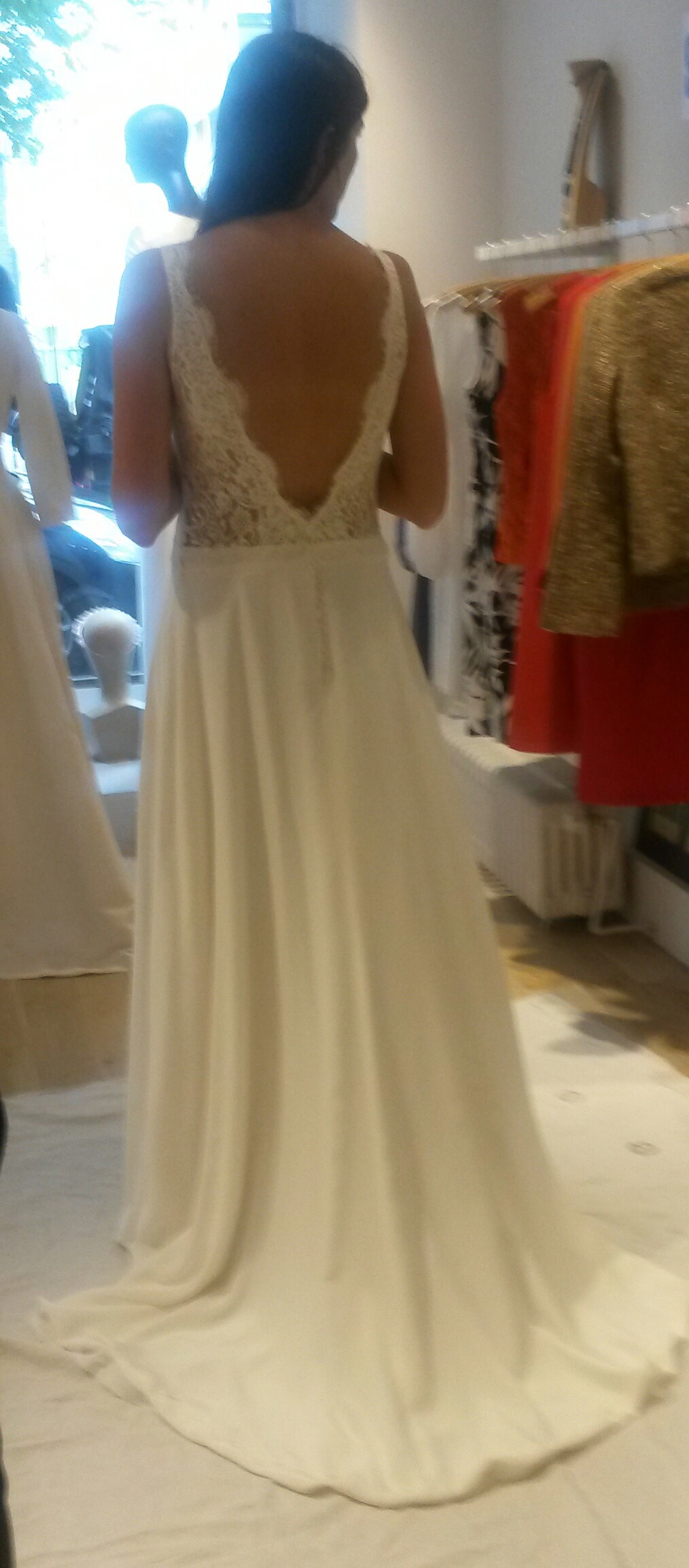 Nouveau modèle de robe de mariée, Vous pouvez l'essayer dès aujourd'hui à la boutique. En dentelle et crêpe de soie, avec un beau décolleté dans le dos.