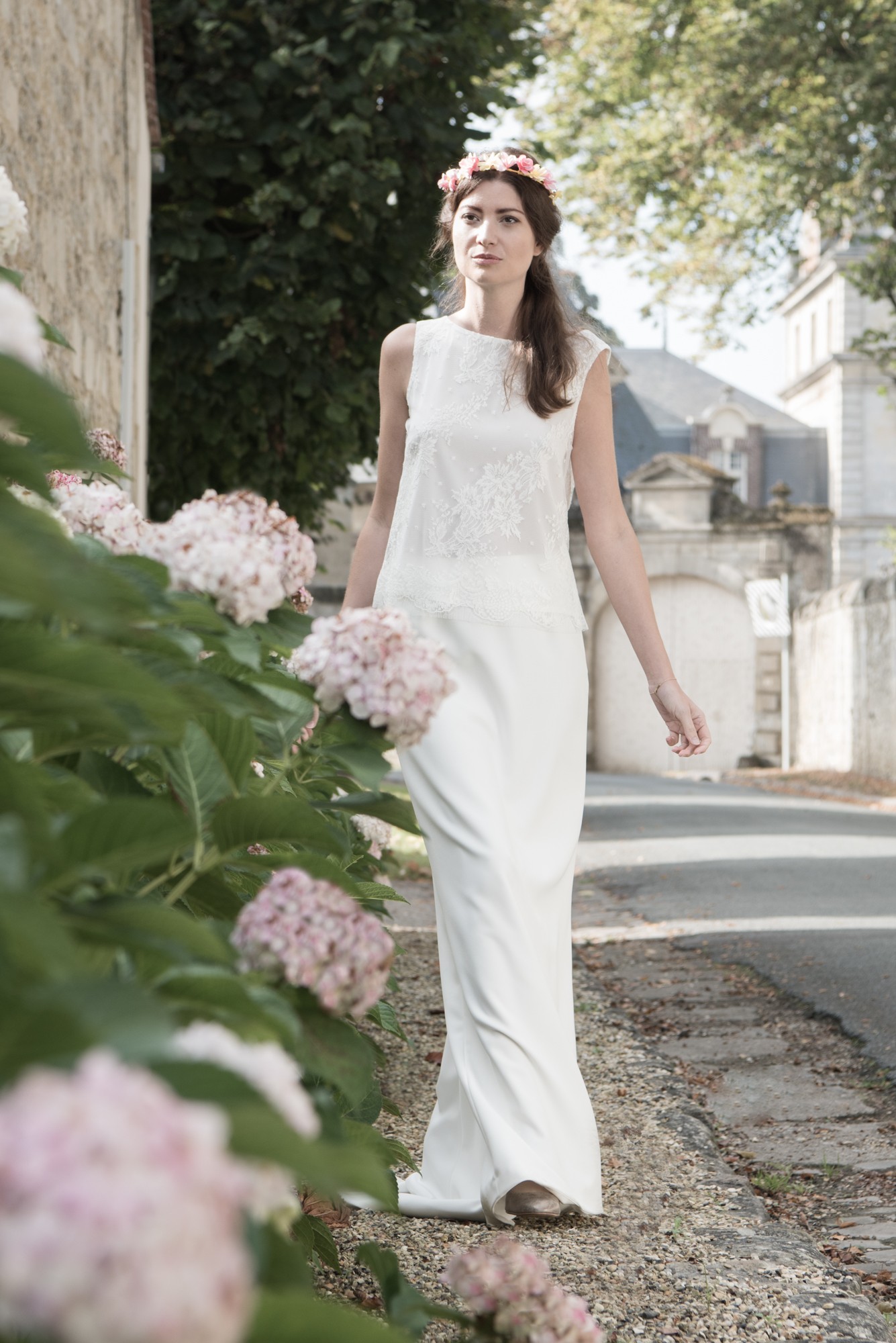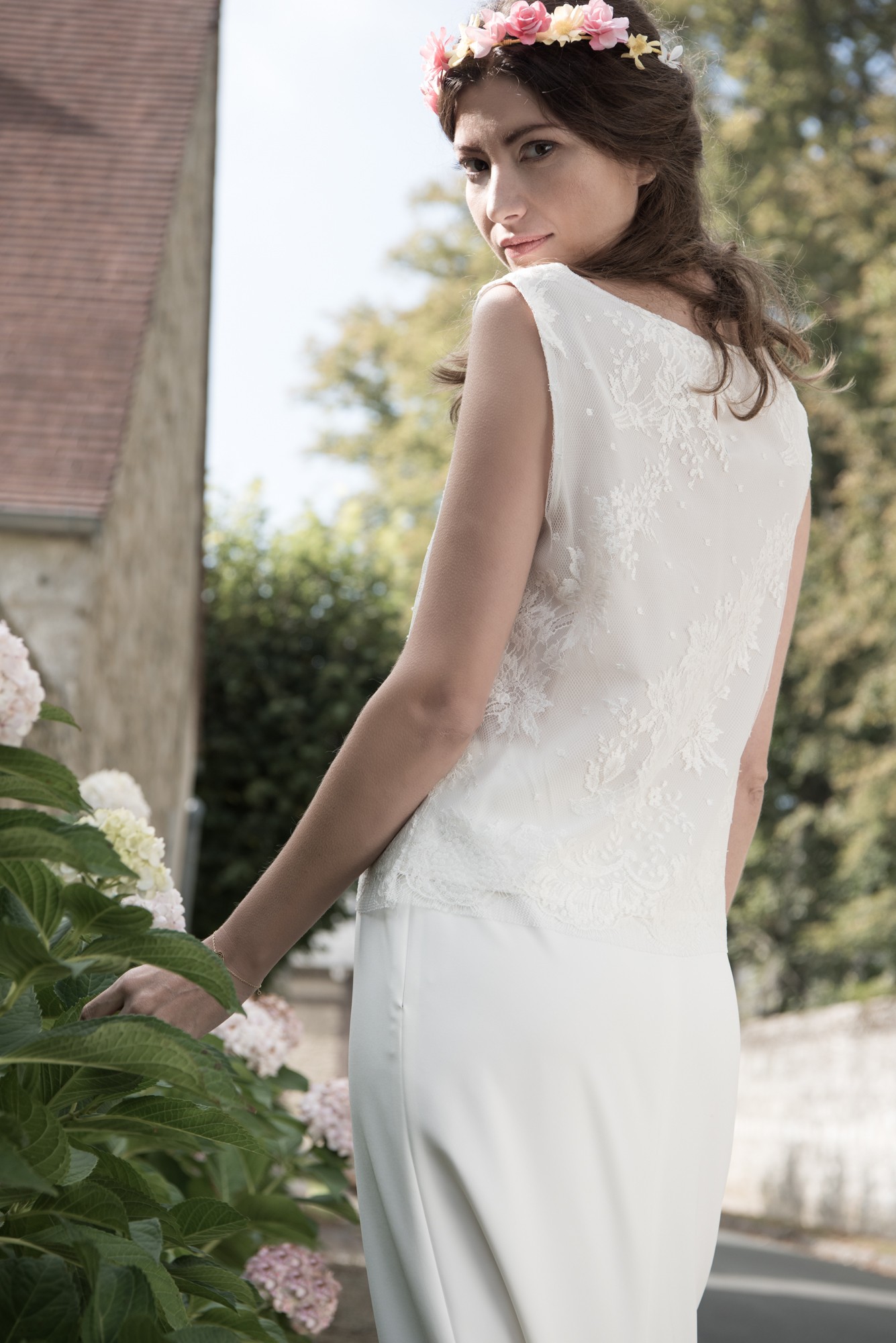 Modèle Luisa : jupe fourreau en crêpe avec petite traine, Modèle Lena : top en dentelle de Calais
