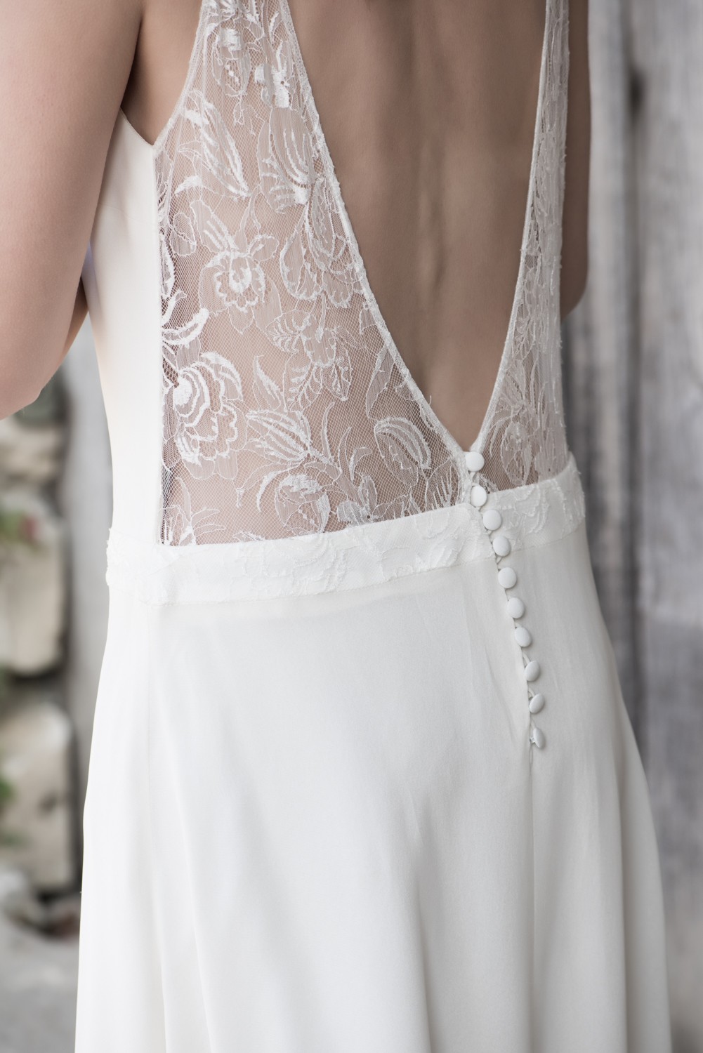 Tais porte le modèle Dora en crêpe de soie et dentelle de Calais. Décolleté V devant en dentelle appliquée sur crêpe de soie, dos en dentelle, petits boutons