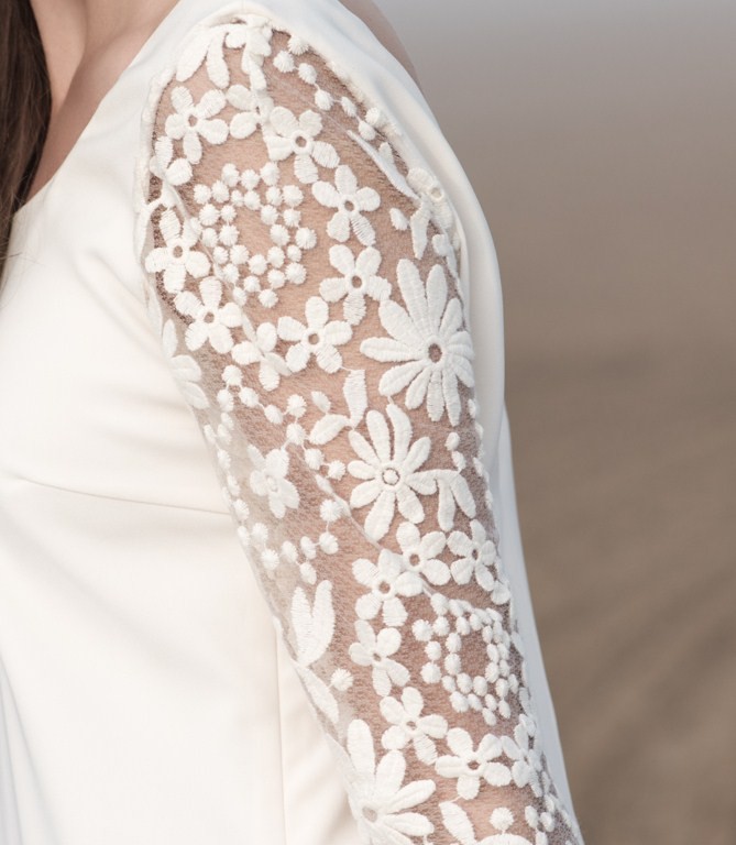 Tais porte le modèle dèle Greta en crêpe ivoire, manches et quille dos en tulle rebrodé. Décolleté arrondis devant et en V dans le dos.