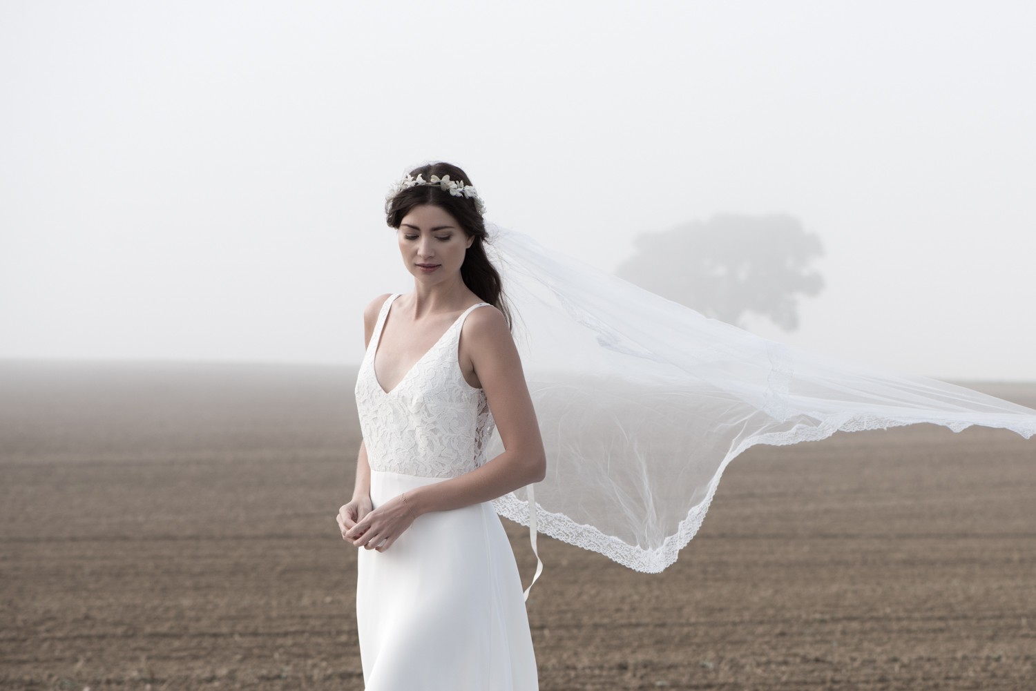 Tais porte le modèle Mylena en crêpe de soie et tulle plumetis neige.