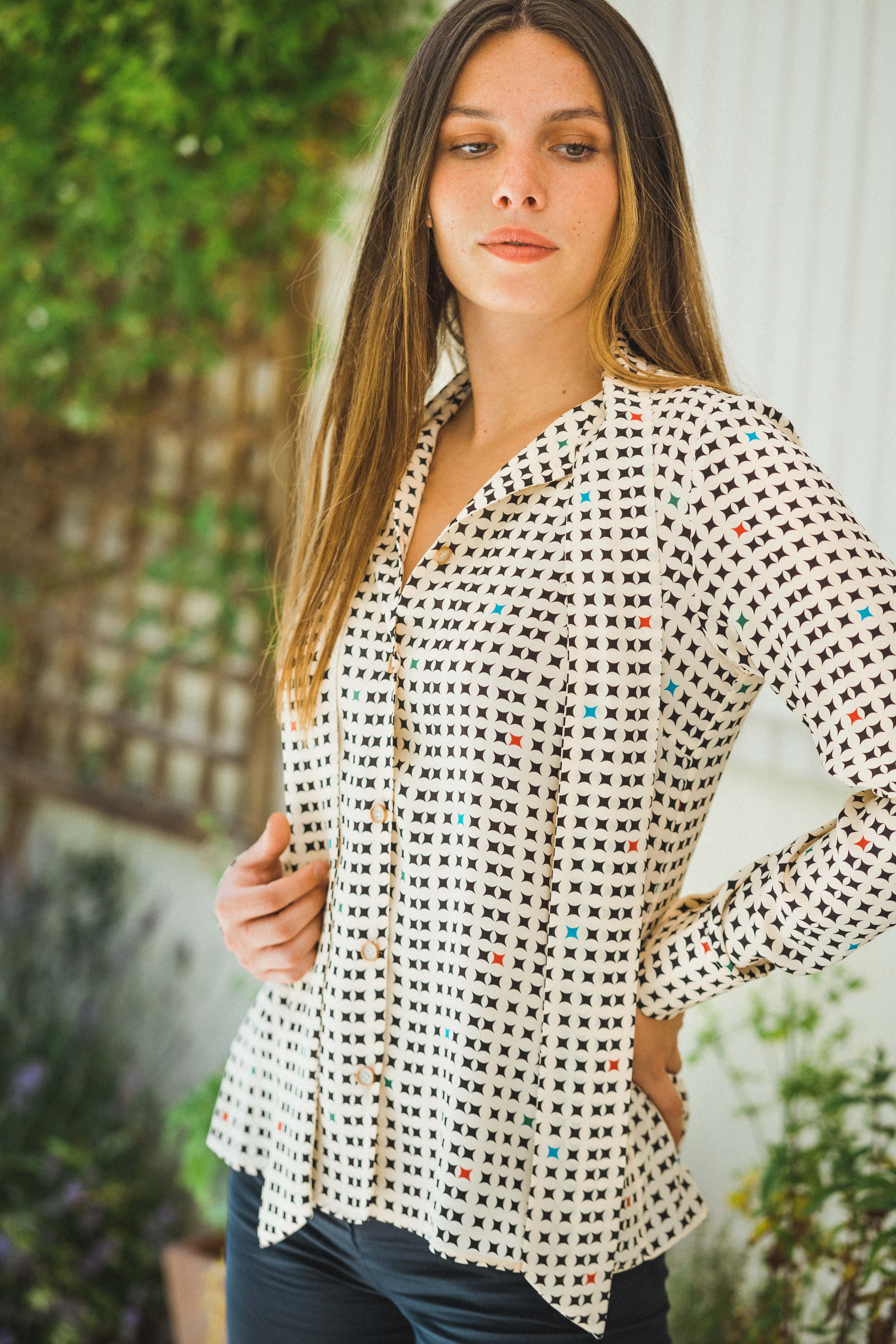 Emma porte un chemisier en soie imprimée avec lavalliere.